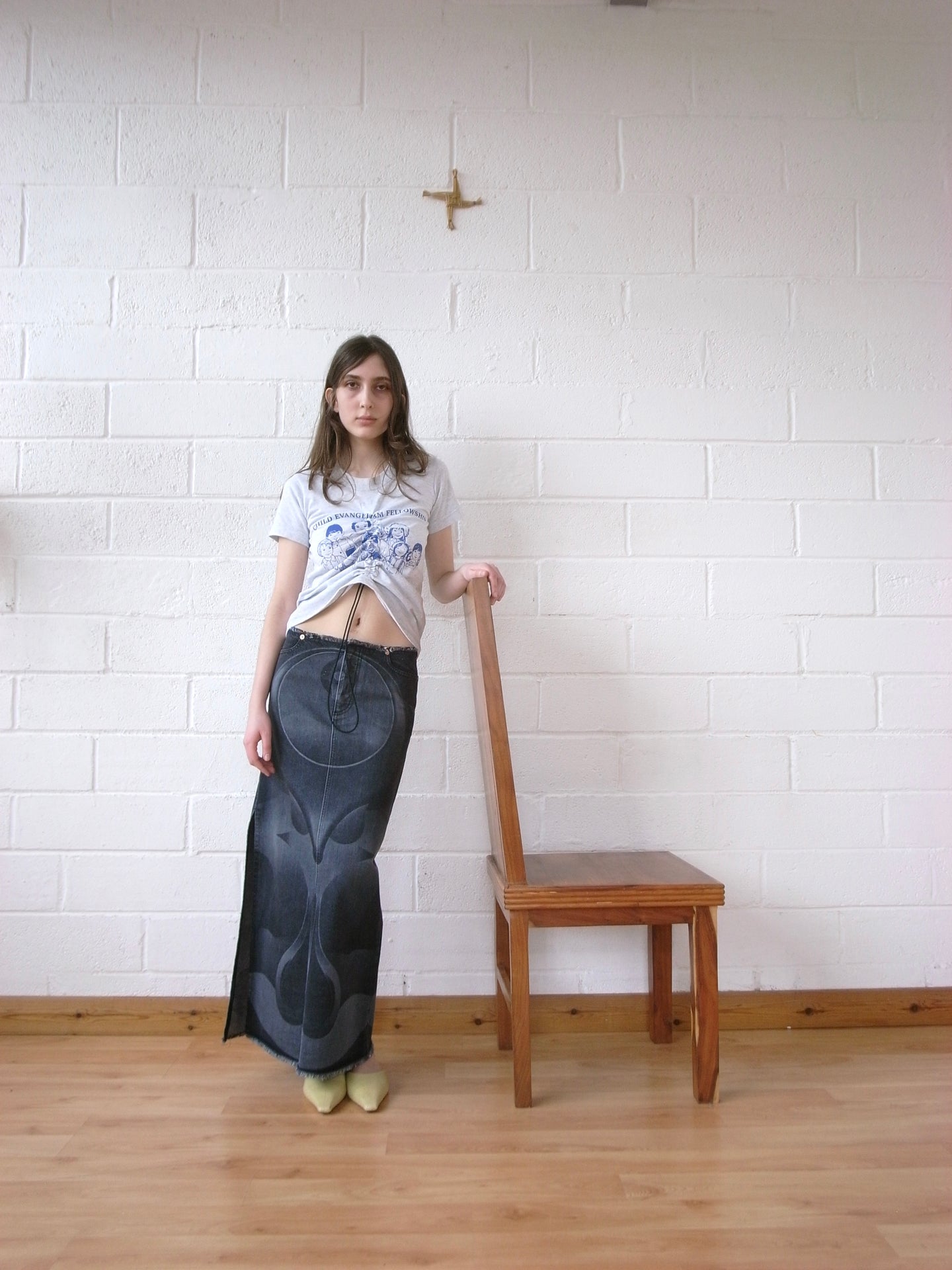 Look 13 from S/S 2024’s collection titled Late Capitalism, The Jersey Toggle T-shirt is crafted from vintage t-shirts. The tees a re disassembled, stitched with a centre-front channel that holds an elastic cord which can be cinched at the bottom of the tee, creating a rouching effect up the front. Due to the adjustable nature of the toggle, the top can be worn in a plethora of ways, inviting you to gauge how high or low, you want to go. Made in Portugal.