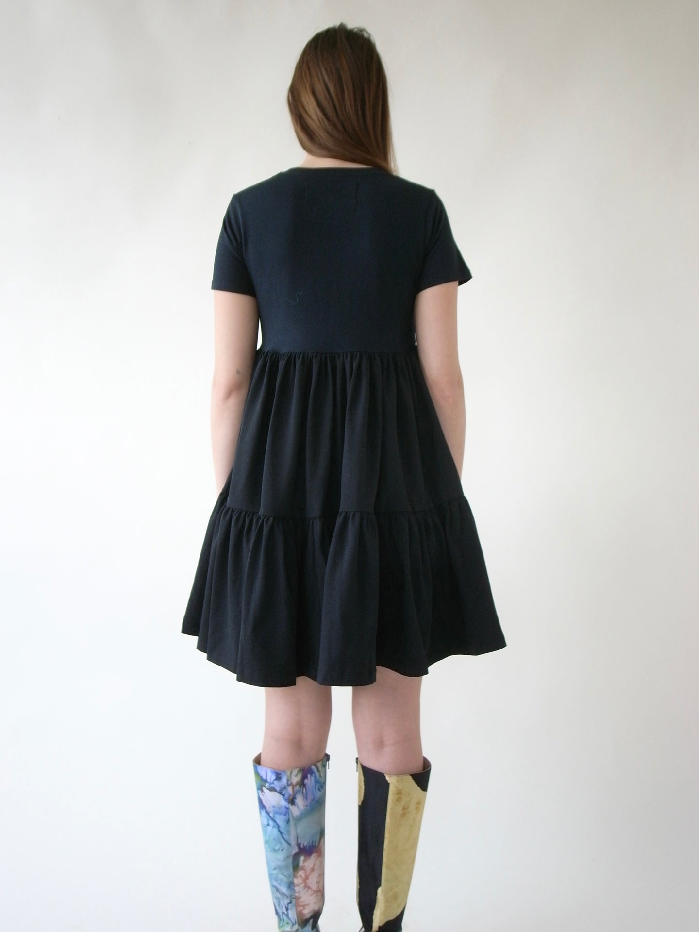 From A/W 2023’s collection titled Magnolia, This Jersey Baby Doll Mini Dress is cut from black vintage t-shirts, Making each dress entirely unique. The A- Line silhouette is created from 2 tiers of gathered jersey, attached to the cropped hem of the vintage tee. The technique recontextualizes the already familiar concept of a baby doll dress into something foreign, but completely new. The dress can be worn alone as a dress, or as a long tee with jeans or trousers. Made in Portugal.