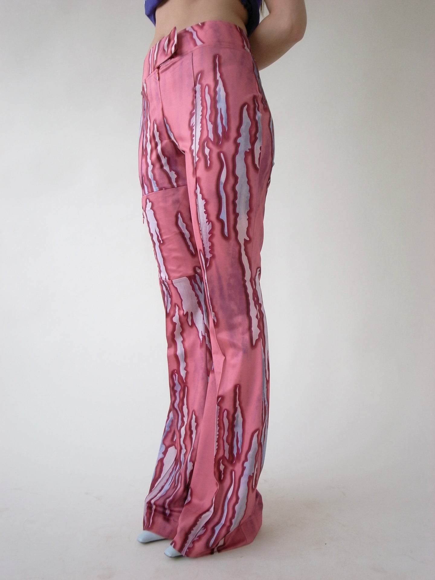 Look 18 from A/W 2023’s collection titled Magnolia, This Recycled Spandex flared trouser features a pink tear print that was inspired by a Vintage scarf. The print is rendered on a recycled spandex, one of our signature recycled textiles. The trousers feature a pin-tucked pleat down the legs, a concealed zip pocket on the upper thigh, concealed zip fly and hook and bar waistband closure. Shown here with The Recycled spandex Shirt in flower print. Made in Portugal.