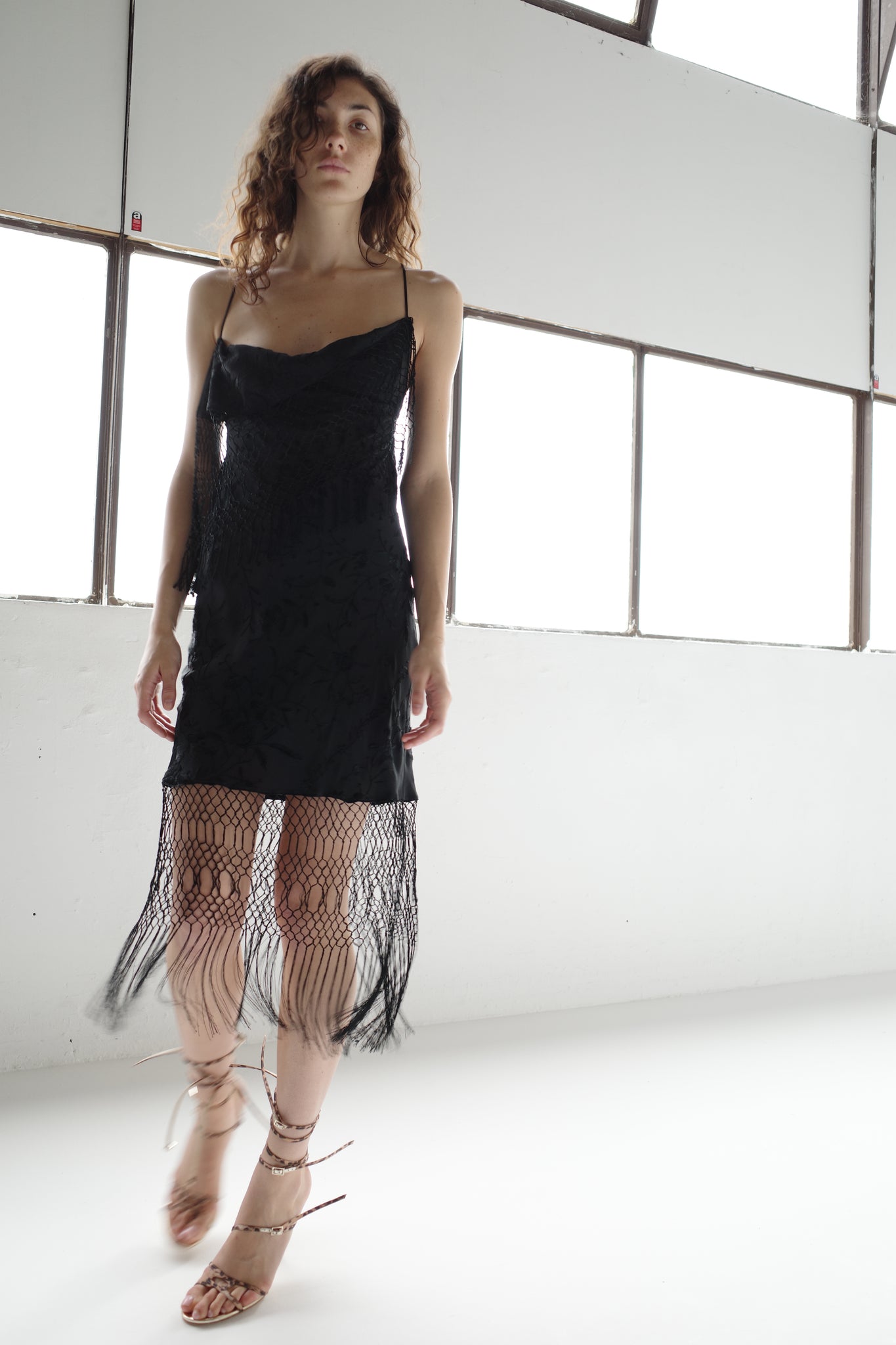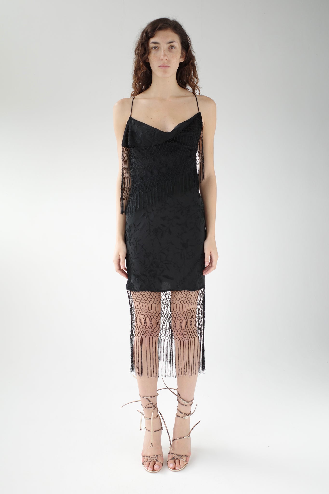 Made from Vintage Silk Piano shawls sourced by Conner, each dress is entirely one of a kind. This cowl neck style features hand-knotted macrame at the neck and hem, a bias silk construction with floral motif hand-embroidery , and self-tie straps that cross the back, allowing for a custom fit. The perfect party dress, exclusively yours. Made by hand in our London Atelier.