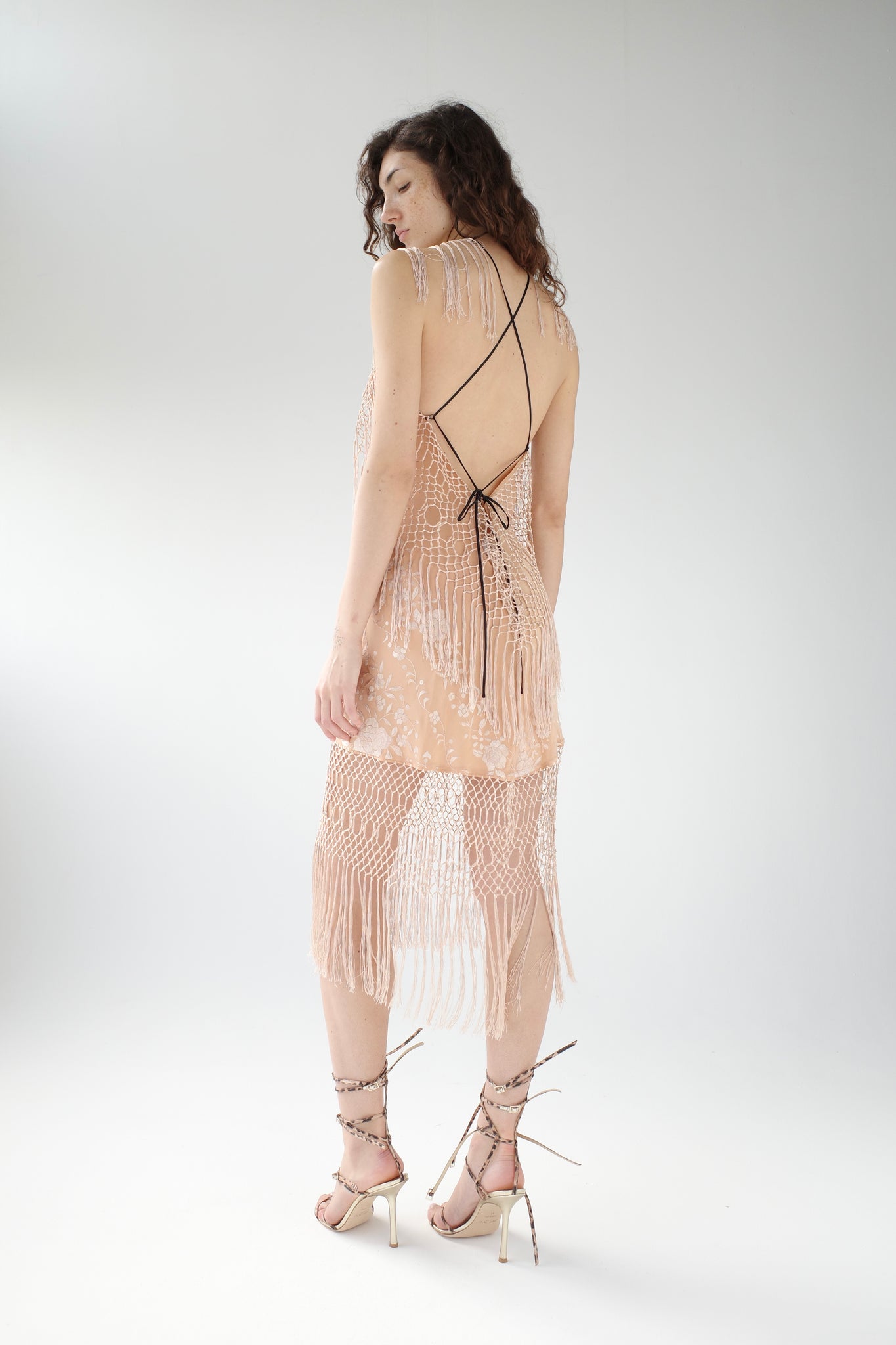 Made from Vintage Silk Piano shawls sourced by Conner, each dress is entirely one of a kind. This halter style features hand-knotted macrame at the neck and hem, a deep-v neck that fastens at the top with floral motif hand-embroidery, and self-tie straps that cross the back, allowing for a custom fit. The perfect party dress, exclusively yours. Made by hand in our London Atelier.