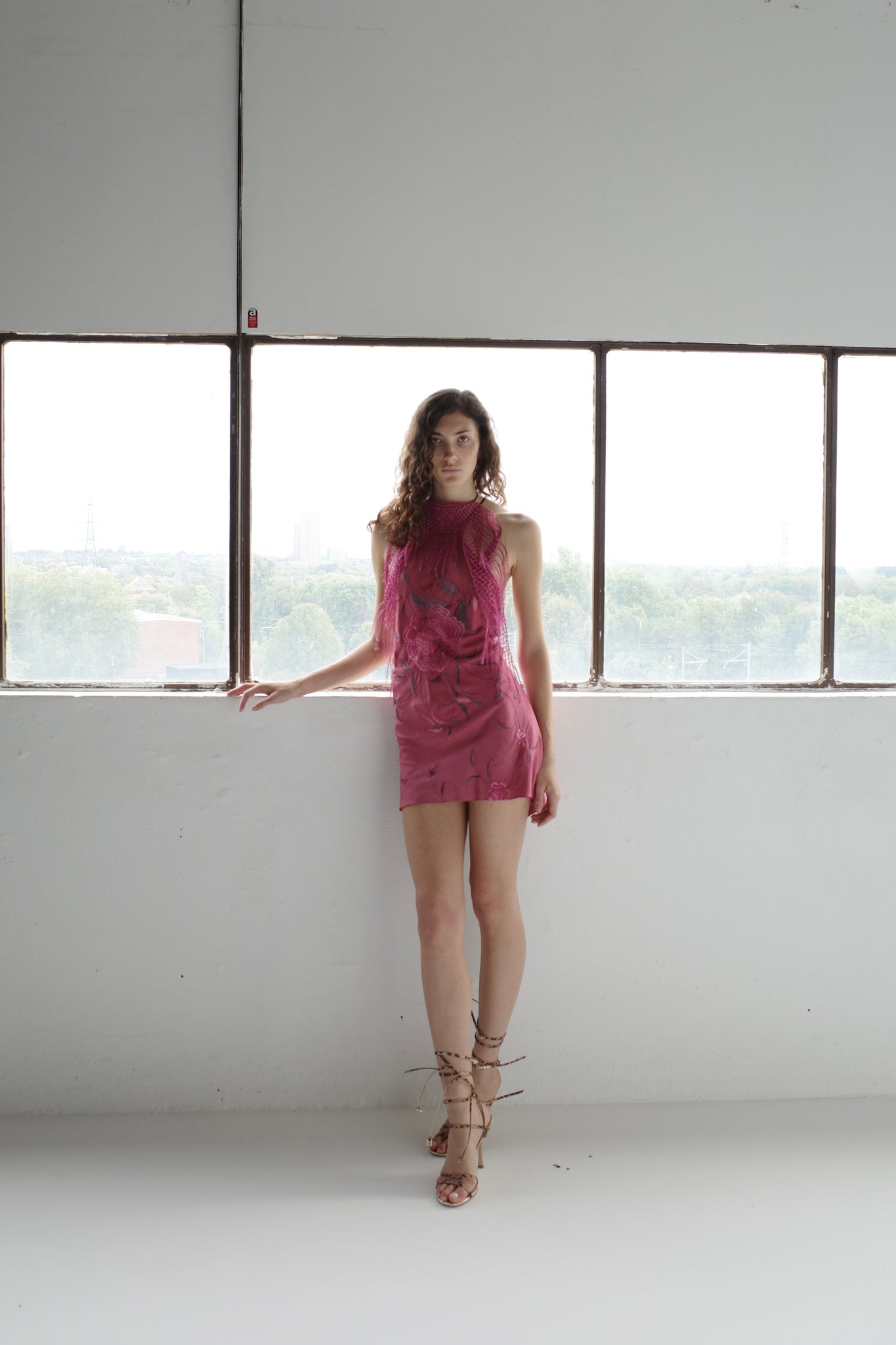 Made from Vintage Silk Piano shawls sourced by Conner, each dress is entirely one of a kind. This halter style features hand-knotted macrame at the neck, a bias silk construction with floral motif hand-embroidery , and self-tie straps that cross the back, allowing for a custom fit. The perfect party dress, exclusively yours. Made by hand in our London Atelier.