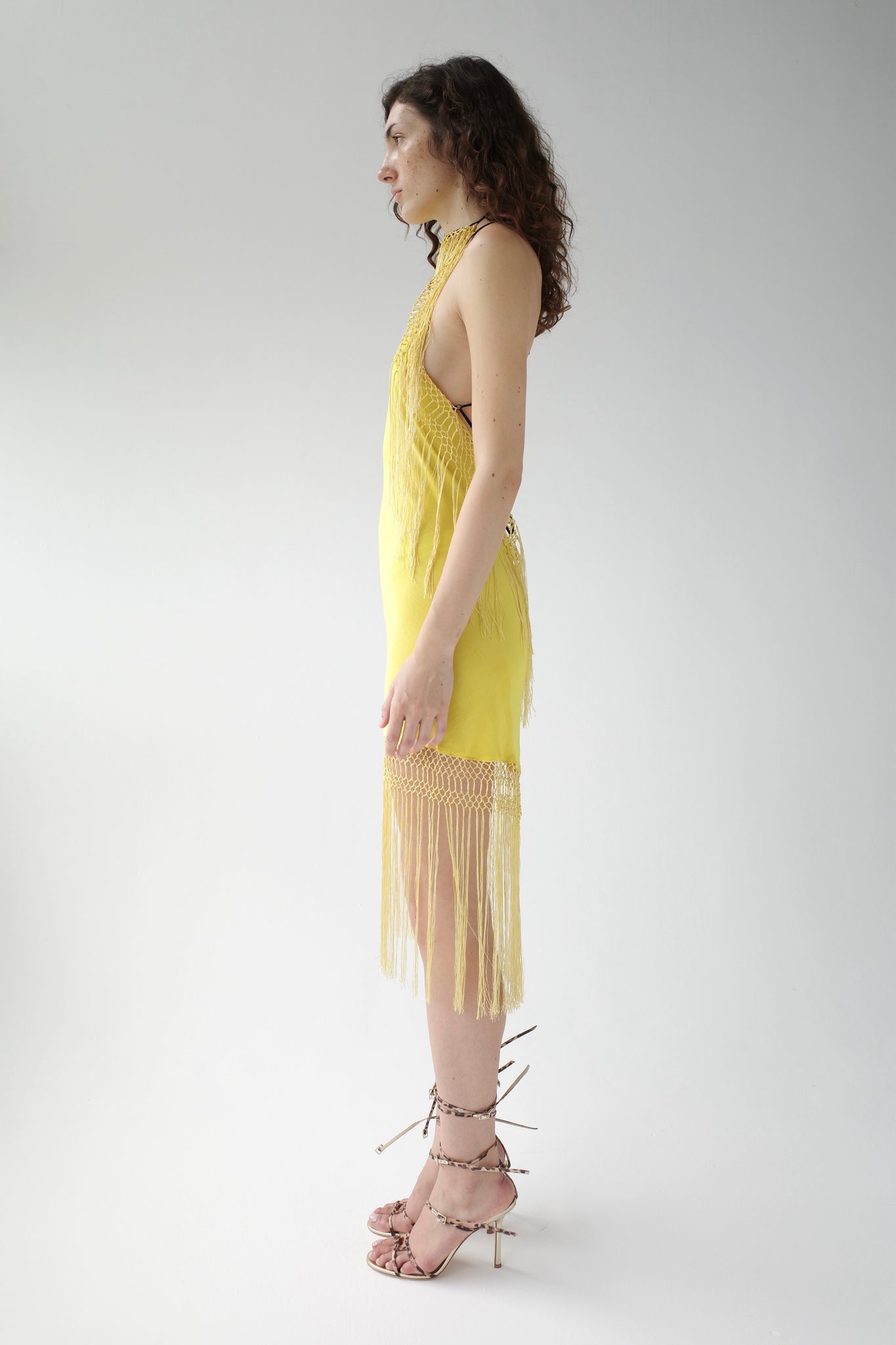 Made from Vintage Silk Piano shawls sourced by Conner, each dress is entirely one of a kind. This halter style features hand-knotted macrame at the neck and hem, a bias silk construction, and self-tie straps that cross the back, allowing for a custom fit. The perfect party dress, exclusively yours. Made by hand in our London Atelier.