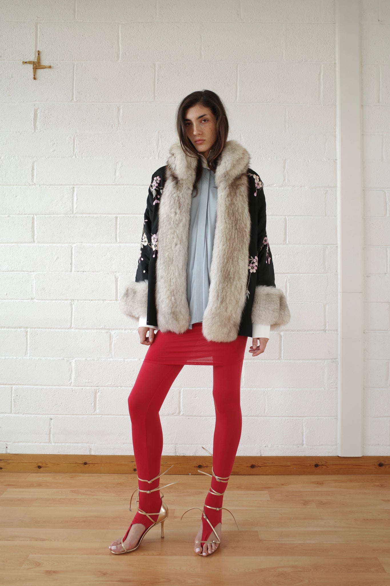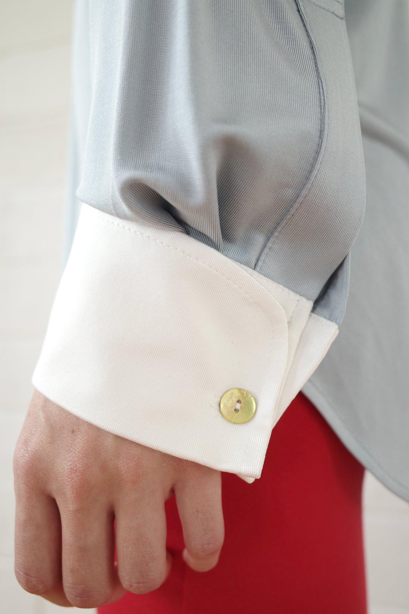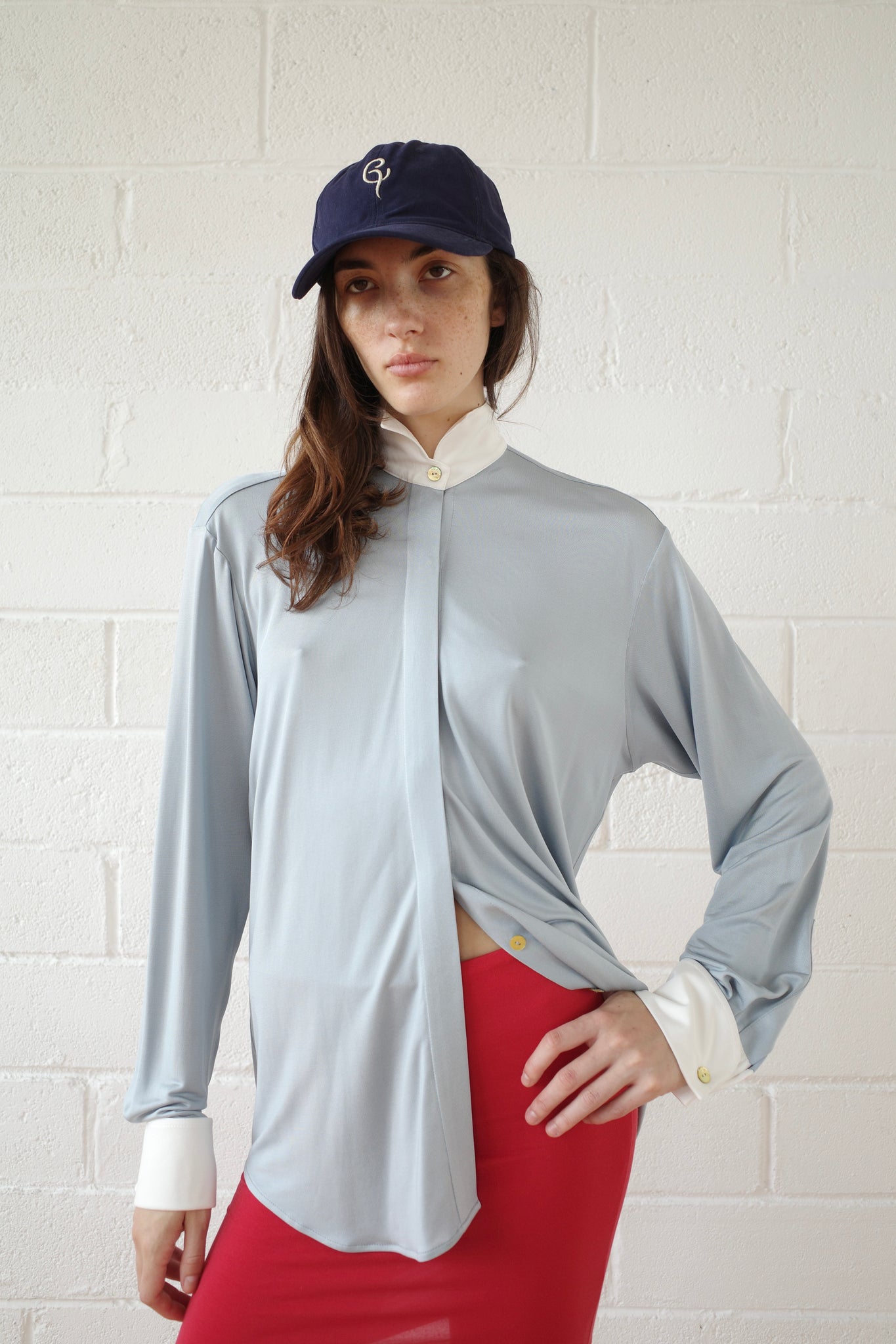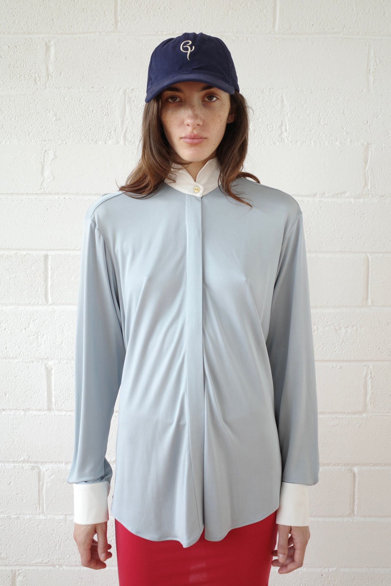 From A/W 2025's All that Jazz, The Silk Jersey Winged Collar Shirt is made entirely from our favourite silk jersey, offering a more languid take on black tie dressing. Inspiration was taken from one of Conner's vintage black tie shirts, The shirt features a concealed placket with mother of pearl buttons, winged collar and cuffs and collar in a contrast white. Made in London.