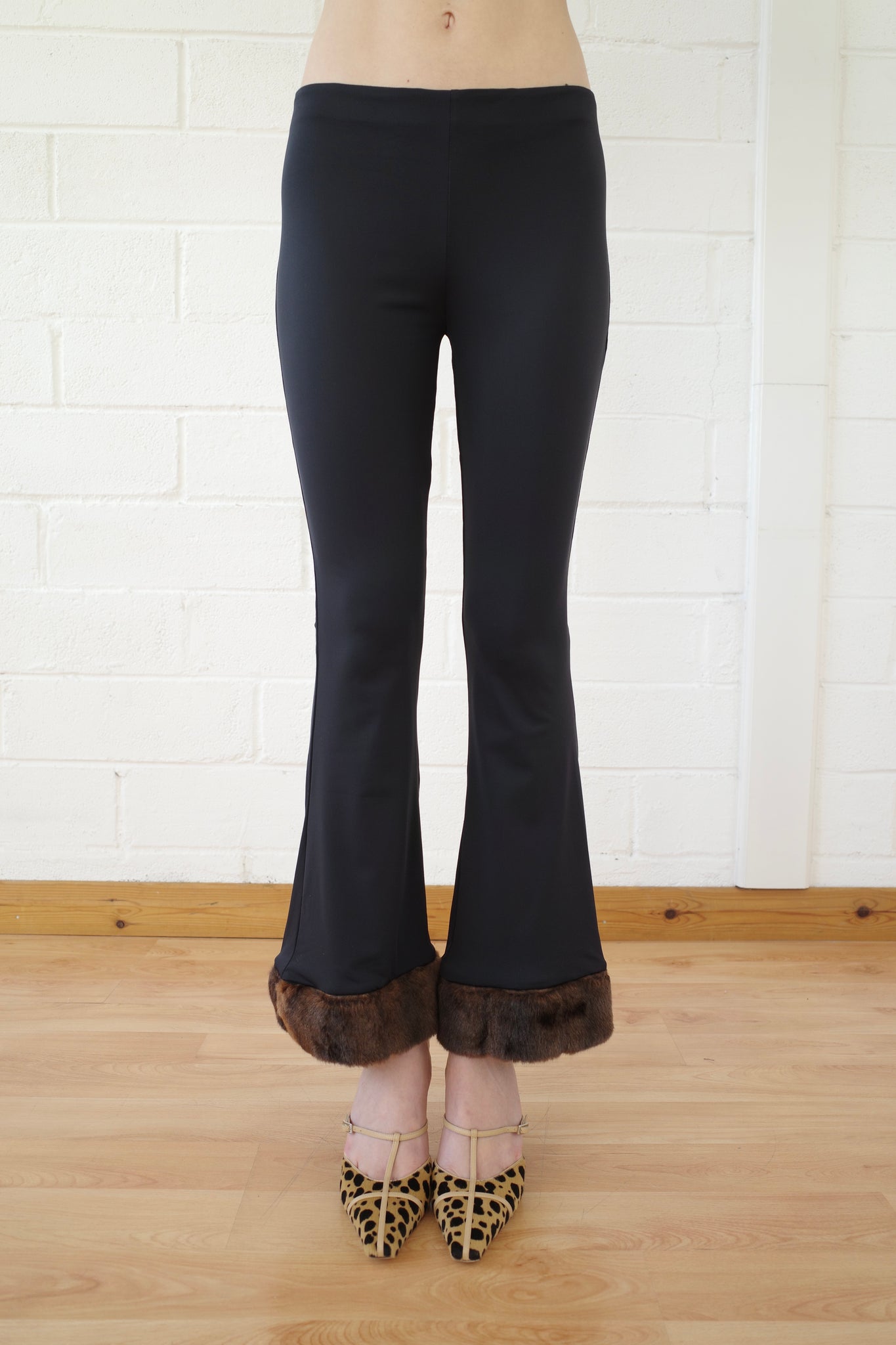 Featured in A/W 2025's All that Jazz, The recycled spandex and faux mink- trimmed trouser is made from recycled Black spandex and has a soft matte finish. The trouser is trimmed in a dead stock faux mink trim at the hem, and the waist is finished with a satin-effect elastic that sits comfortably across the high hip. The trouser is cut close to the body, with a flare at the knee that finishes at the ankle. The comfort of athleisure mixed with the luxury of ladies who lunch. Made in London.