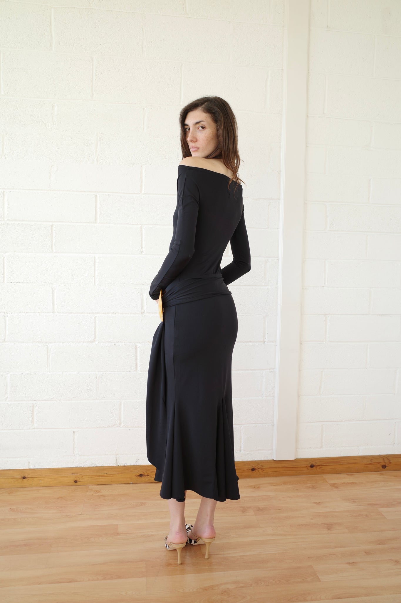 From A/W 2025's collection All that Jazz, This dress is cut in a recycled Black spandex and has a soft matte finish. Inspired by our best-selling Mother of Pearl Shell belt dress, this dress features a bateau neckline and long sleeves that are grown onto the form-fitting body. Godet inserts at the hem form a mermaid shape. A sash belt in the same material wraps around the wearer’s midsection, anchored behind a golden Mother of Pearl shell buckle. Made in London.